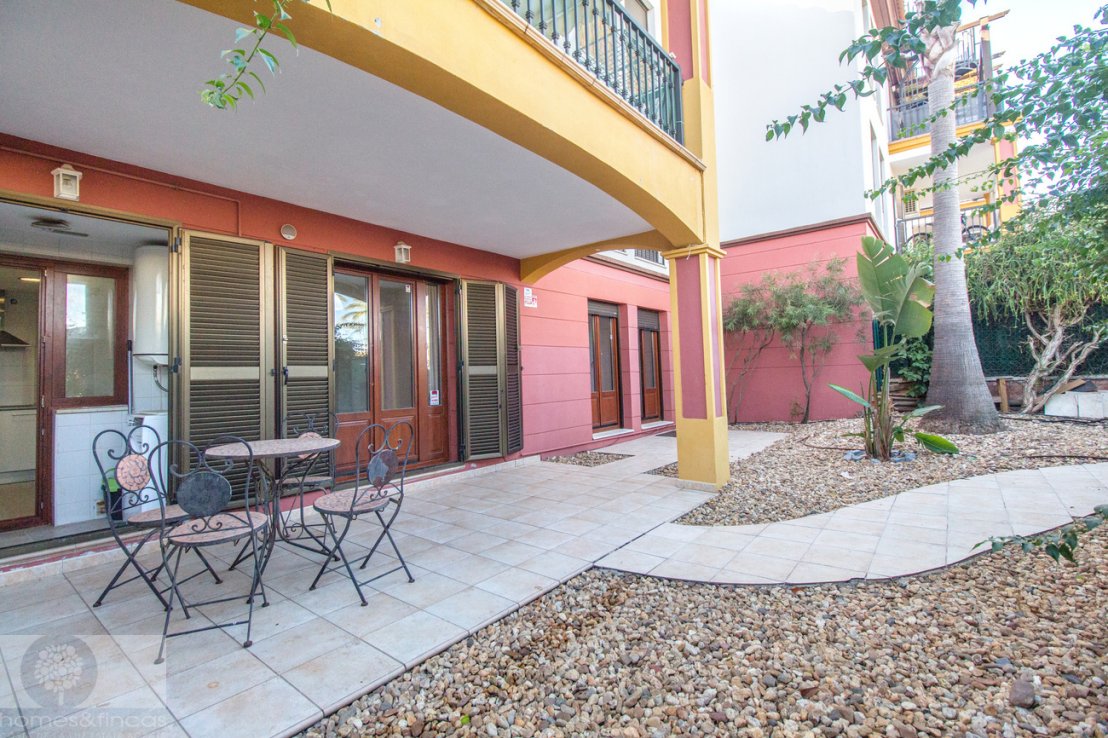 The property offers two comfortable bedrooms and two bathrooms, one of them en-suite. The fully equipped kitchen includes a separate utility area, providing functionality and convenience for everyday life. The bright and spacious living room opens onto a large private garden — the ideal space for relaxing, dining outdoors, or enjoying the mild Andalusian climate all year round.