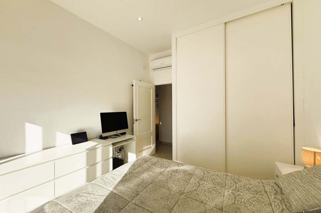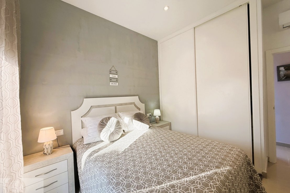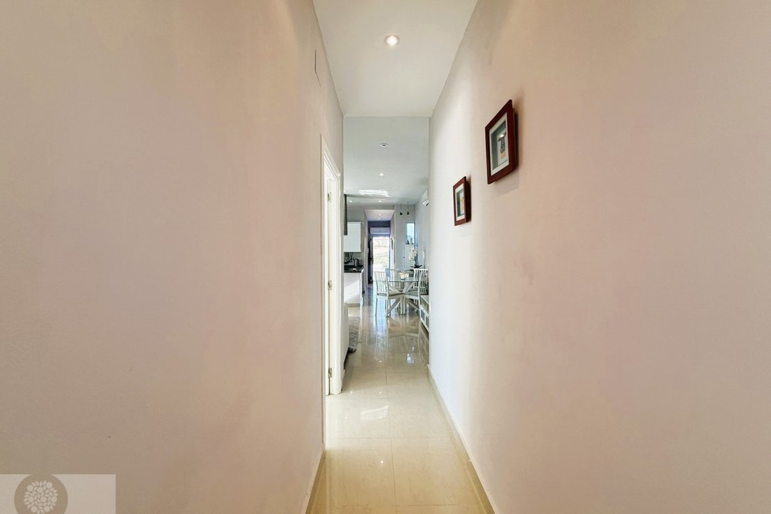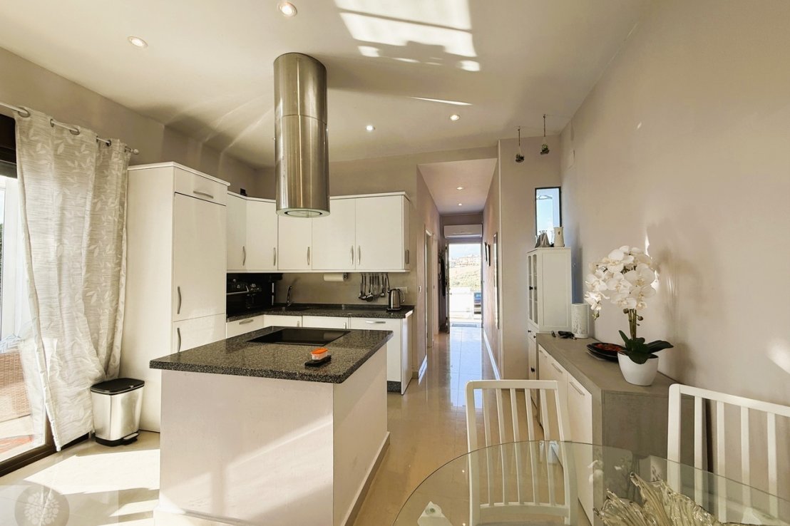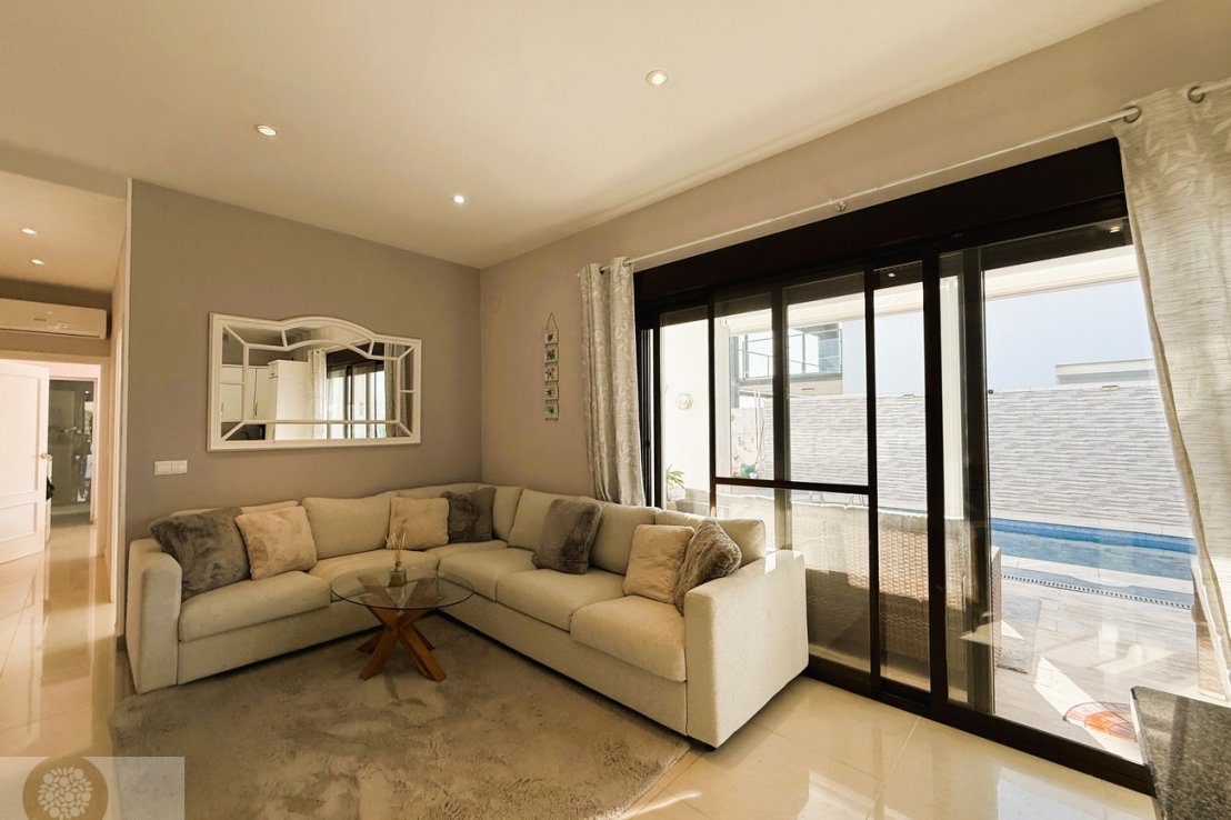 It features 3 bedrooms with fitted wardrobes, 2 full bathrooms and an additional guest toilet. The spacious living-dining area provides direct access to the outdoor space with a private swimming pool, perfect for enjoying the sunny climate all year round.